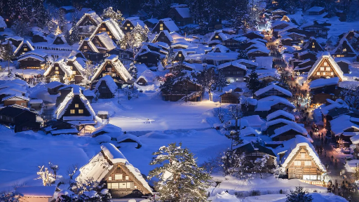 Hoạt động: Các ngôi nhà truyền thống gassho-zukuri được chiếu sáng bởi đèn và tuyết, tạo nên bức tranh tuyệt vời của làng truyền thống.